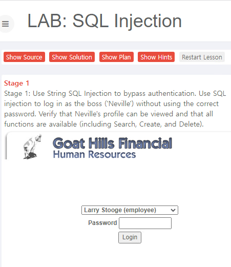 WebGoat에서 sql injection 분야의 stage1 string sql injection 문제입니다.